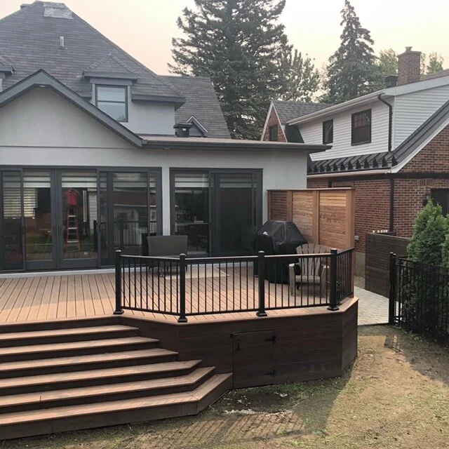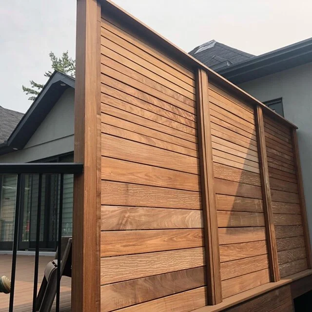 Écran d’intimité: Sur mesure, en ipé monté à l’horizontale avec motif graduel et poteaux de 4 x 4 / Privacy Wall: Custom, horizontal IPE, gradient pattern, 4x4 posts.
