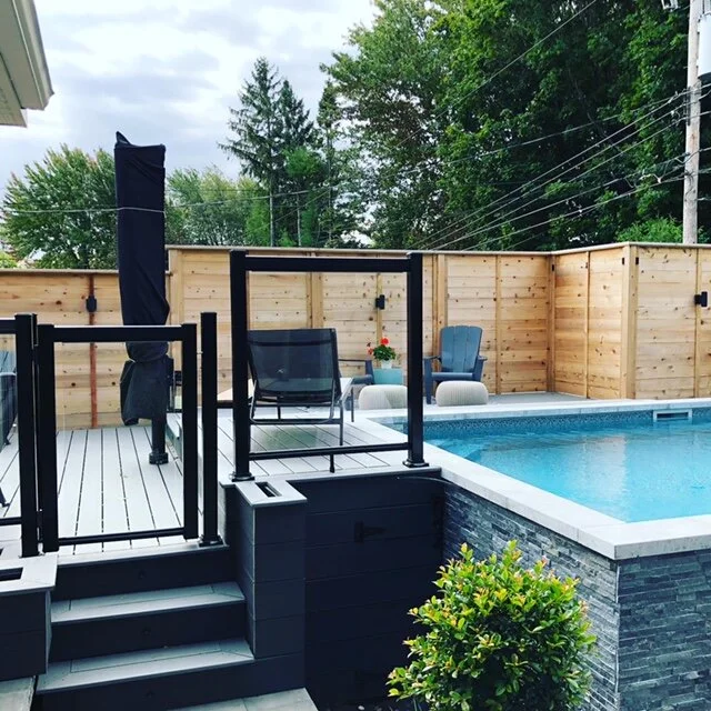 Pourtour: En Clam Shell de Trex monté à l’horizontale / Skirting: Horizontal style with Trex Clam Shell.